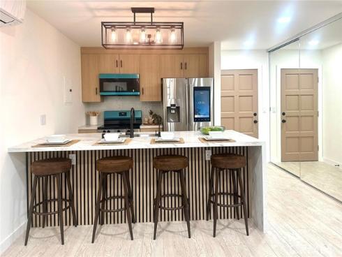 !!!!Price reduced for a Fast Sale!!!! Super motivated seller with a unit ready to sell. This stunning 1-Bedroom, 1 Den & a 1-bath corner unit features High-End Upgrades all throughout the condominium! No one Below or Above. The unit is located in Santa Ana's premium South Coast Metro Area! The condominium offers top-of-the-line plumbing fixtures & electrical updates with a complete internal floor plan redesign. The home features an open floor plan that seamlessly blends the spacious living area with modern comforts and finishes. Once you step inside, you’ll discover a modern space with sleek, minimalist design, premium materials and high-end finishing touches. The airy living room offers plenty of space for relaxation and entertainment. The kitchen offers brand-new stylish appliances, elite quartz countertops and modern cabinetry. The unit boasts one Bedroom & a Den with customizable closets. The bathroom is fully remodeled with all modern tendencies & high-quality materials. The unit has newly installed windows and a patio door that leads to a fully restored balcony. The assigned parking spot is conveniently located right underneath the condominium, which also provides a spacious locked storage unit. The condominium is located in a gated community , offers three pools and a spa, and it is pet-friendly. The community is located in a bustling area with easy access to South Coast Plaza, Schools, Parks and Beaches. Don't miss the opportunity to own this fully renovated home in a great location!