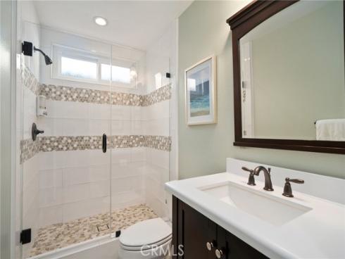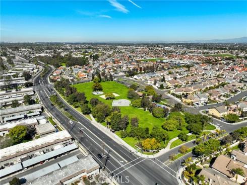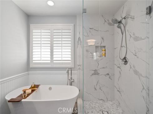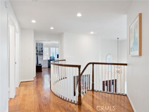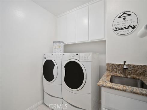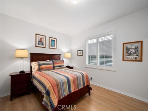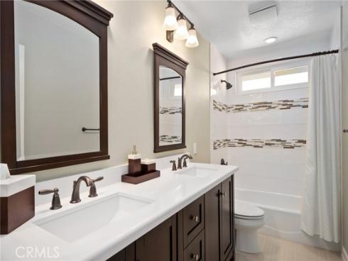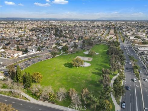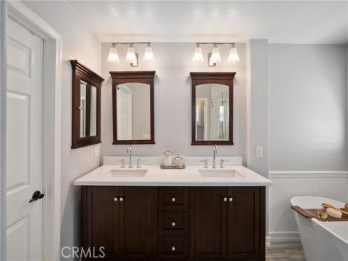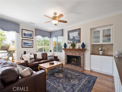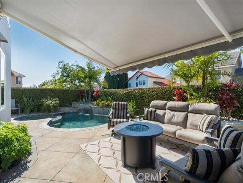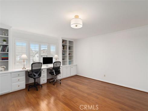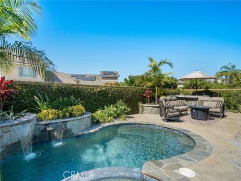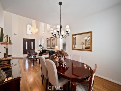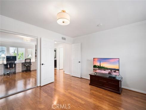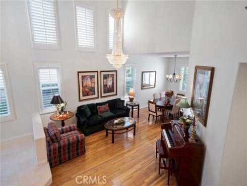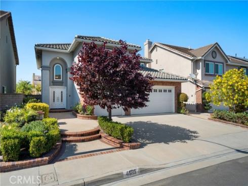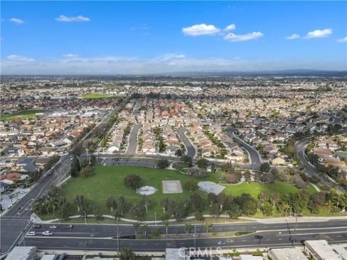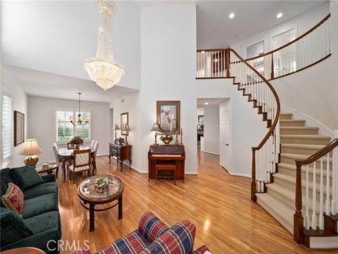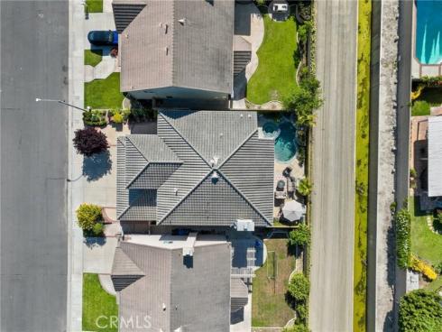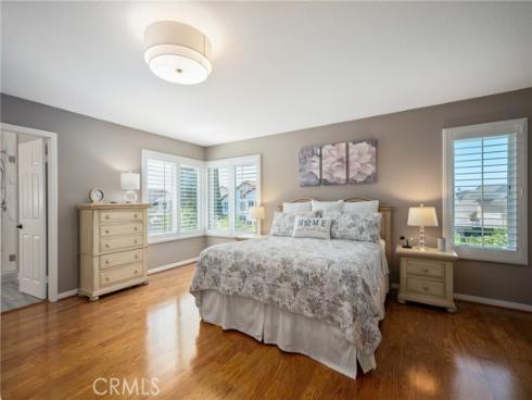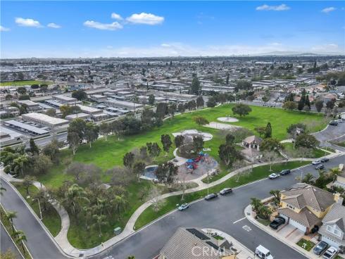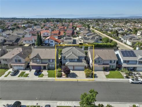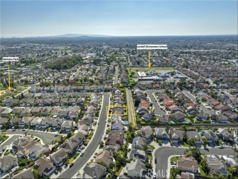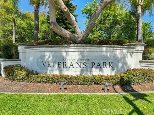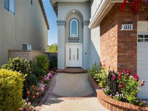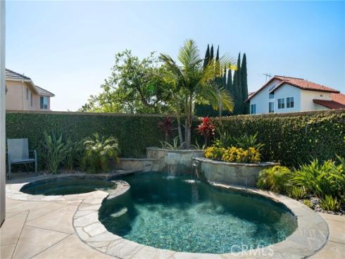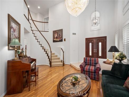 Welcome to the home with everything - the largest Gallery model in the prestigious Sorrento community of Cypress. One of the final Sorrento homes built in 1996, this beautifully maintained home offers approximately 2,939 square feet of elegant living space, featuring five spacious bedrooms and three full baths. A highly desirable main-level bedroom and full bath provide flexible living options for extended family or as a guest room. Step through the formal double-door entry into a grand two-story foyer finished with marble flooring, and into the step-down formal living room. The formal dining room is ideal for entertaining and offers views of the beautifully landscaped backyard. The separate family room features a cozy brick fireplace, custom built-in shelving, and a full entertainment center. The upgraded kitchen offers granite counters, stainless steel appliances, deep walk-in pantry with custom shelving, and an adjoining daily dining area - perfect for casual meals and gatherings. Upstairs, the luxurious primary suite welcomes you with double-entry doors, a spacious walk-in closet, and a completely upgraded en-suite bath. The primary bath is thoughtfully designed with new vanity cabinetry, dual wash basins, a deep pedestal soaking tub, and a beautiful marble finished custom shower. The oversized fifth bedroom is a versatile bonus room featuring a full closet and exquisite built-in dual desks - ideal for a home office or study space, play room for the children, or a fabulous theatre room. The second level also includes three additional generously sized bedrooms. One secondary bedroom offers two walk-in closets. The upgraded main bath includes dual sinks and modern finishes. Additional features throughout the home include custom hardwood flooring, central air conditioning, plantation shutters, recessed lighting, rounded corners, and raised-panel interior doors with upgraded hardware. The main-level laundry room is equipped with storage cabinetry and a wash basin for added convenience. Step outside to your private backyard oasis. The professionally landscaped yard features a custom heated pool and spa with stone-accented waterfalls, mature tropical plants, a built-in stainless steel barbecue grill, and a stone-finished outdoor dining counter, and electric patio cover - perfect for entertaining guests year-round. Located just a short walk from the Sorrento community park.