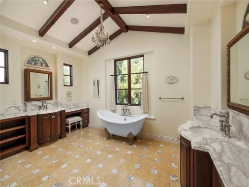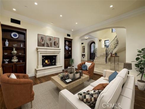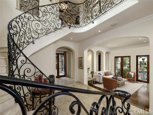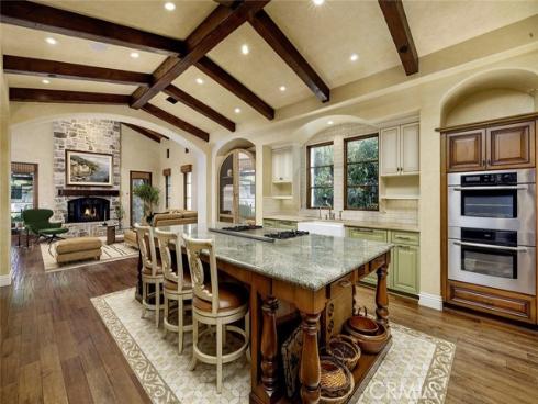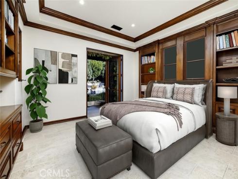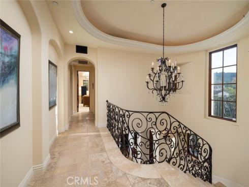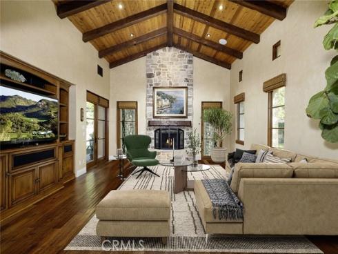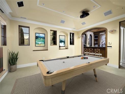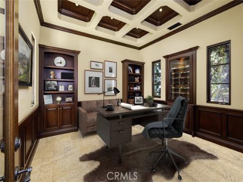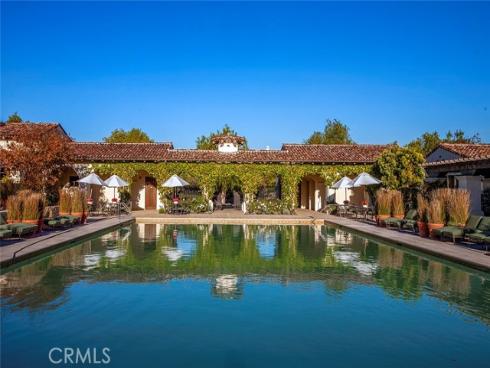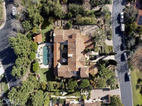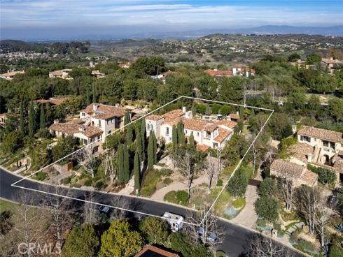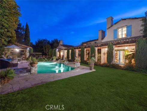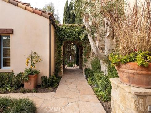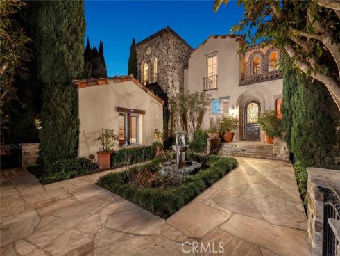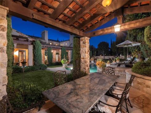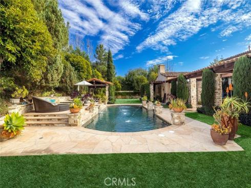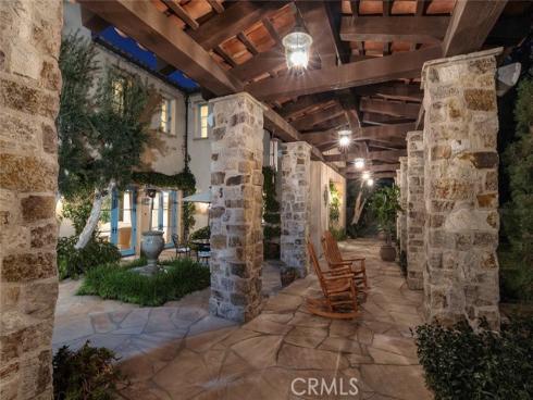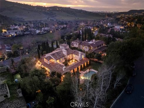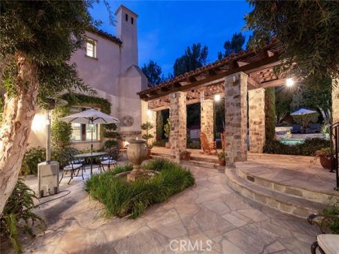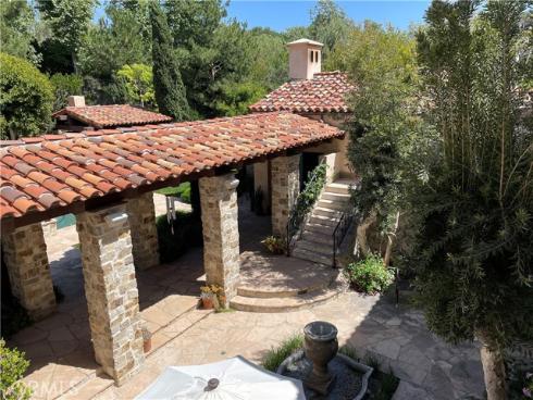 Nestled within the prestigious 24-hour gated and patrolled enclave of Shady Canyon, this custom estate epitomizes luxury living within a backdrop reminiscent of the Tuscan Vistas in Italy. Situated on a sprawling 28,009 sqft parcel, this magnificent residence boasts 5 bedrooms and 4 ½ bathrooms across an expansive 7,232 sqft of living space. Upon entering, you are greeted by a grand open air front entry courtyard enveloped by lush, mature landscaping, setting the tone for the opulence within. The home features a host of amenities, including a theater, executive wood-clad office, and an upstairs lounge, providing ample space for both relaxation and entertainment. For the automotive enthusiast, a motor court leading to the garage offers plenty of room for parking and storage. Inside, a bar and billiards room provide the perfect setting for social gatherings, while formal living and dining rooms exude elegance and sophistication. The master retreat is a sanctuary unto itself, boasting a spacious bedroom with a impressive fireplace, a stone-clad bathroom, a generous walk-in closet, and a balcony overlooking the picturesque surroundings. The heart of the home is the gourmet kitchen, which opens to a breakfast nook and informal living room centered around a real wood-burning fireplace, creating an inviting space for family gatherings and everyday living. Outside, the meticulously landscaped exteriors feature fine hardscapes and majestic pathways leading to a private, tree-lined backyard. A series of loggias and covered dining spaces with an outdoor kitchen, pizza oven and BBQ offer the perfect setting for al fresco dining and entertaining. Lounge spaces, a salt water pebble tech pool, and a spa provide resort-like amenities, while raised planter beds and mature citrus trees ensure an abundance of fresh fruit year-round. Additionally, a detached guest casita offers privacy and comfort for visitors, completing this unparalleled estate in the coveted country club community of Shady Canyon.